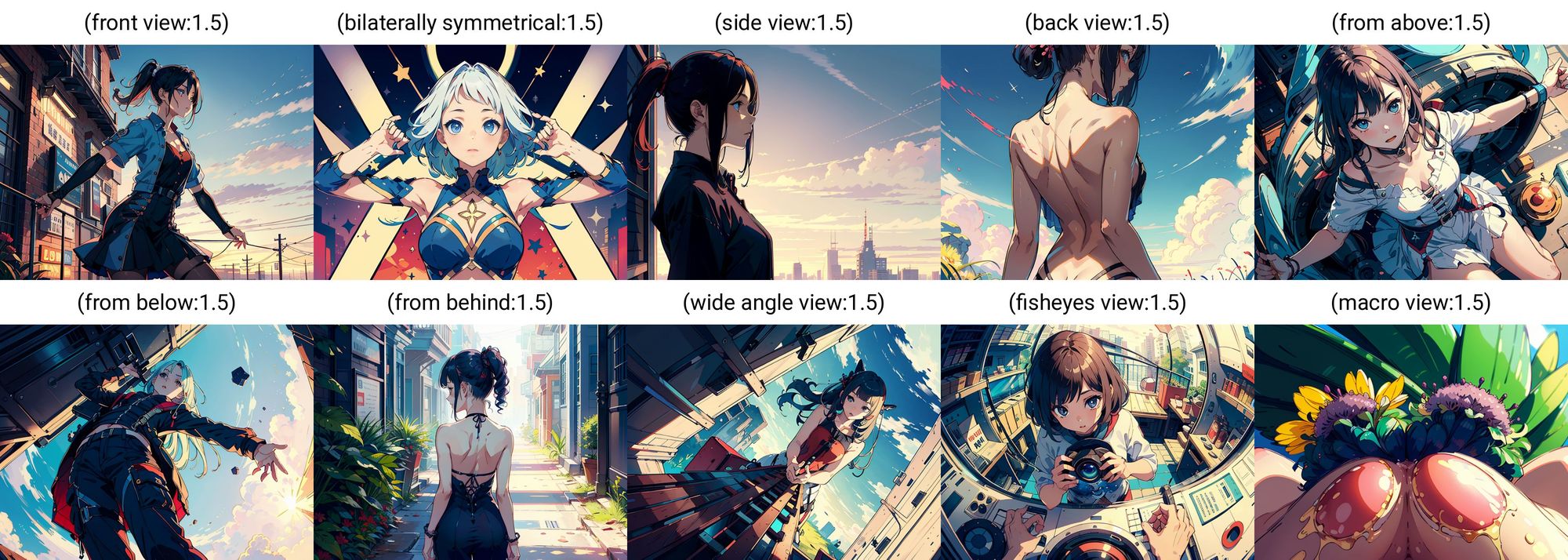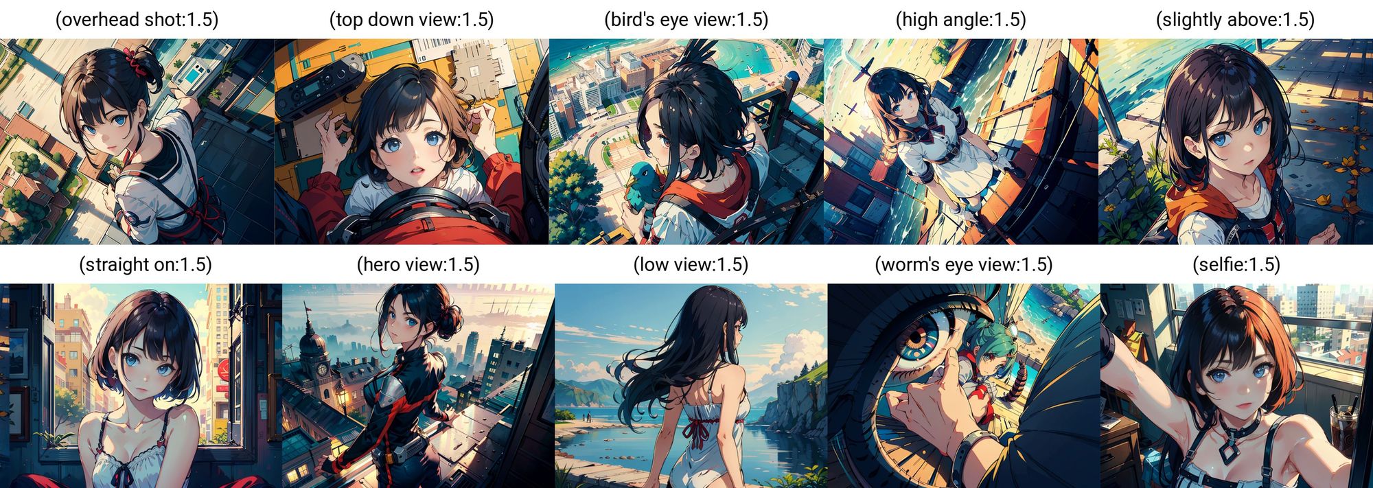 front view straight on就是正面,但不一定是绝对正面,straight on因为水平拍摄的角度所以背景也不会歪。bilateral symmetry正面兼左右对称,比正面更准确。side view向左/向右都是随机的。back view跟 from behind 都是背面,back view会近一点,而且通常露背。from above overhead shot high angle slightly above都是由高角度影向主体,overhead shot角度较高,high angle会背景比较阔一些。from below由下方偷拍(?) 的视角,天空通常会筒状变形。wide angle背景会有一些筒状变形fisheyes view 的变形效果会更强,但fisheyes view 受到污染,总会拿着相机。macro view变了拍花或微细的物件。bird's eye view从高角度影高去同时会见到广阔的背景,但会有雀鸟出现。top down的角度很糟糕(?),变成正上方被女生抱住的视角。hero view角度不对,人物也受污染穿上了英雄战衣。low view角度不算很低,有点怀疑没有效果。worm's eye view完全错了,有很多虫及怪眼,跟角度完全没关系。selfie人物会伸手自拍而且不会太远。其中fisheyes view 虽然会污染但因为视角比较特别还是有用的,但hero view 跟worm's eye view 及 macro view受污染角度又不明显可以放弃。