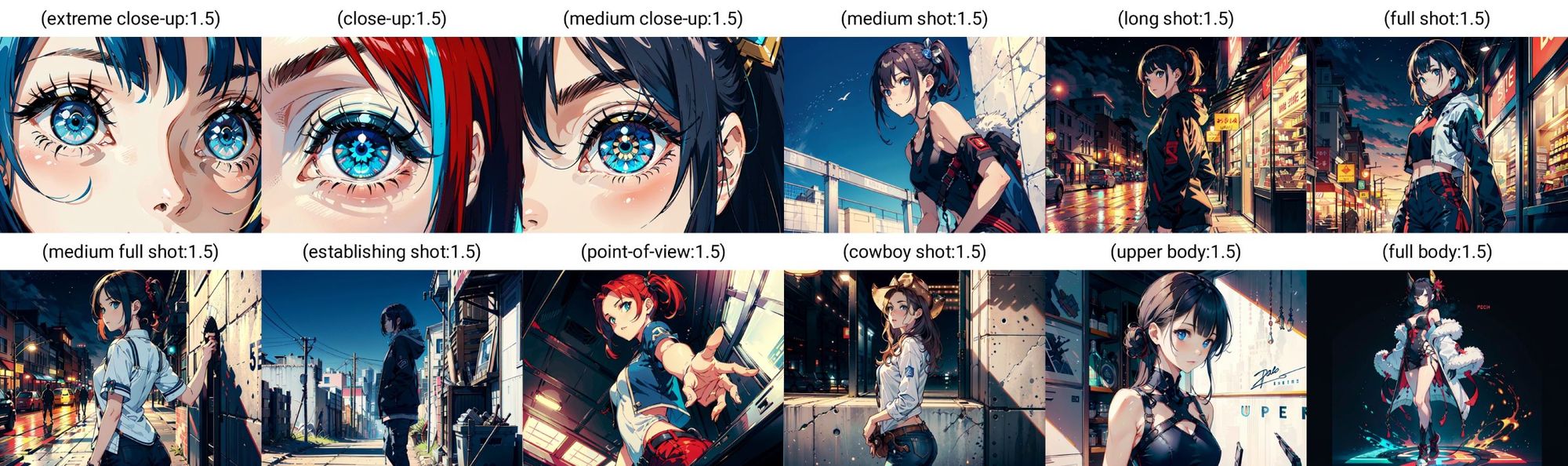 extreme close-up,close-up跟 medium close-up 都是放大眼睛/面部为主,但有时extreme close-up会放大更多。medium shot,long shot,medium full shot 跟full shot 看起来差不多,medium shot有时候会比full shot 更近一点,都是显示臀部以上到头顶的位置,因应场景这几个prompt 的距离可能会有些变化。establishing shot的背景会比较明显,如果主体是建筑时人物可能会更细。point-of-view角度会因应人物有点转变,背景通常比较wide,角度跟主体未必是同一水平视角。cowboy shot受cowboy 污染变了牛仔装,距离跟medium full shot 差不多但距离比较稳定,一定会显示臀部以上到头顶。可以使用half body shot替代。upper body会显示人身上半身,范围可能由臀部以上到胸以上。full body是唯一可以见到全身的距离。extreme close-up> close-up> medium close-up> upper body> medium shot> medium full shot> full body。